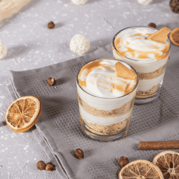 Schichten: zerbröselte Kekse, Quark oder Mascarpone, etwas Dicke Eier. Oben Kakao oder Schokoraspel.
