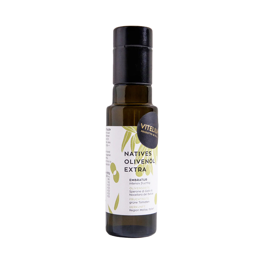 Das Vitelium Embratur Olivenöl Extra Vergine (100 ml) stammt aus eigenem Anbau in Italien. Kaltgepresst, handgeerntet und aus den Sorten Sperone di Gallo und Nocellara del Belice gewonnen – intensiv fruchtig mit Noten von grüner Tomate und feiner Schärfe.